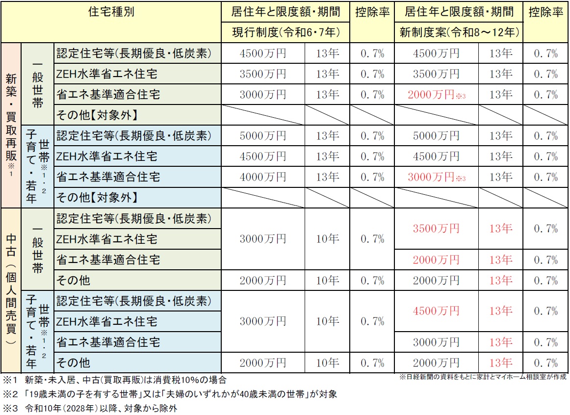 今回の日経報道では、借入限度額が大きく見直される案が示されています。中でも中古住宅の借入限度額の拡大は、住宅ローン減税の歴史でも特に大きな変更点であり、制度の方向性が「新築偏重から中古活用へ」転換しつつあることを示しています。下の表で、現行制度(令和6・7年)と新制度案(令和8~12年)の違いを整理します。