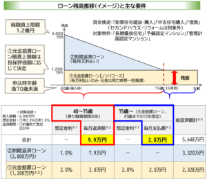 リ・バース60は、60歳以上向けのリバースモーゲージ型住宅ローンで、毎月の支払いは利息のみ、元金は死亡後に売却や相続人の返済で処理する設計です。こちらも住宅金融支援機構と提携する金融機関が提供します。