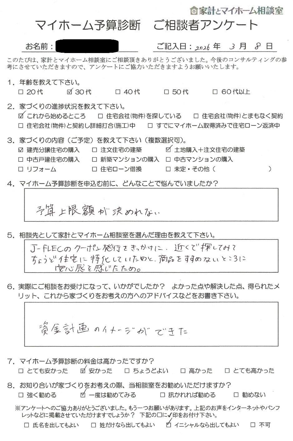 これから戸建て住宅購入の検討を始める名古屋市K.M様にマイホーム予算診断をご提出し、コメントを頂戴いたしました。イニシャ