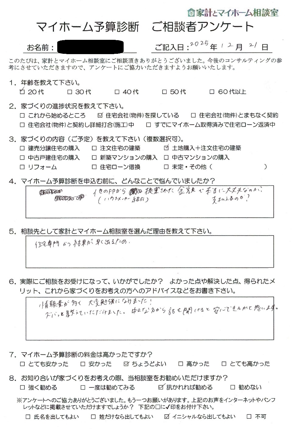 土地購入+注文住宅建築にあたってマイホーム予算診断をご依頼頂いた一宮市J.M様から、ご提出したマイホーム予算診断へのお言葉を頂きました。ご了承頂いたので、下記の通りイニシャルでご紹介いたします。