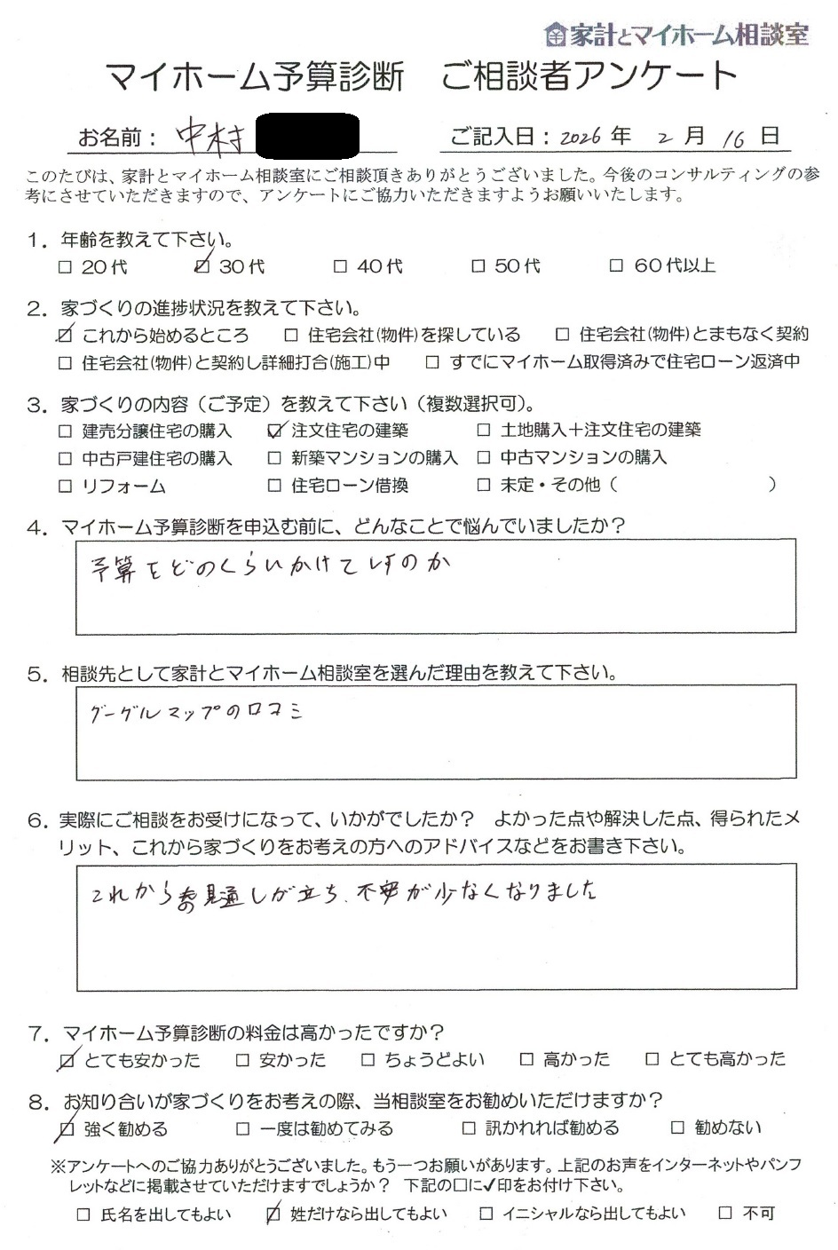 戸建て住宅の建築をご検討している名古屋市の中村様にマイホーム予算診断をご提出し、コメントを頂戴いたしました。姓での掲載をご了承頂きましたので、以下、ご覧下さい。
