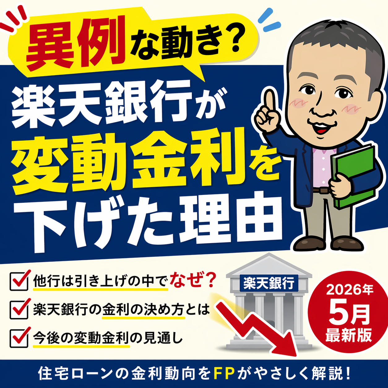 そんな中、先行して来月分の住宅ローン金利を発表した楽天銀行が、5月の変動金利を引き下げるという、少々意外な動きを見せました。他行が引き上げ方向にある中で、なぜ楽天銀行が逆の動きをしたのか。今回は、これまでの3月・4月の流れや他行の動きも踏まえながら、その背景と今後の見通しを整理してみたいと思います。