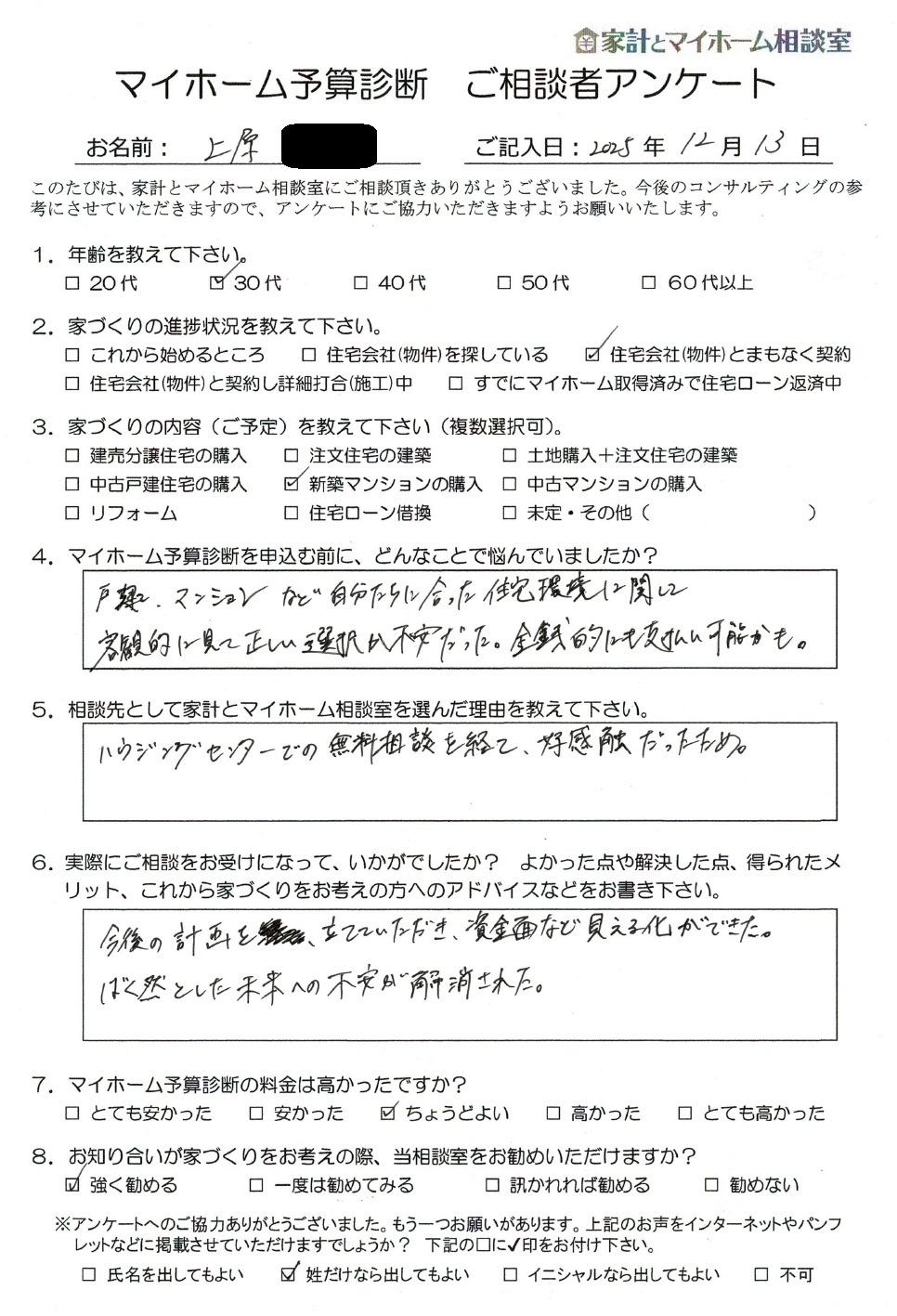 上原様、このたびはご相談ありがとうございました。家計を診断したところ、いまご検討中のマンション購入は問題なさそうです。ただ、今後のお仕事の状況やお子様の進路などによって、家計が変わることもありますので、油断せずに定期的に家計をチェックしてみて下さい。また、お知り合いが家づくりをお考えの際は、当相談室をお勧めいただけるとのこと、ありがとうございます! 今後とも、どうぞよろしくお願いいたします。