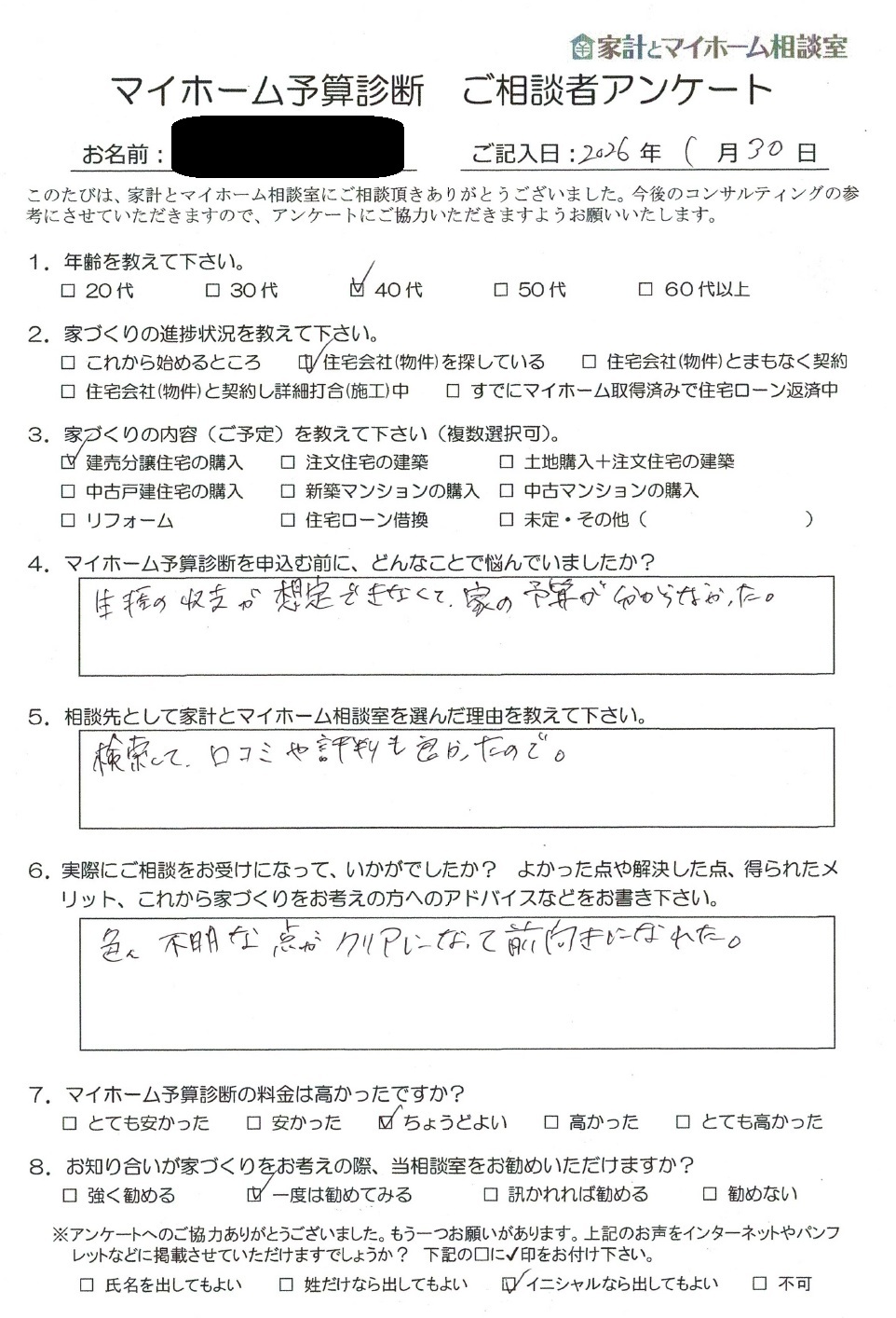 名古屋市内で建売住宅の購入をご検討のG.H様にマイホーム予算診断をご提出したところ、マイホーム予算診断の感想をお寄せいただきました。イニシャルでの公表をご了承頂きましたので、以下、ご紹介いたします。