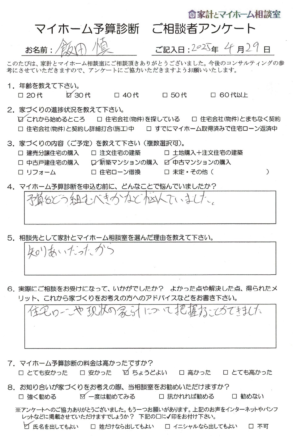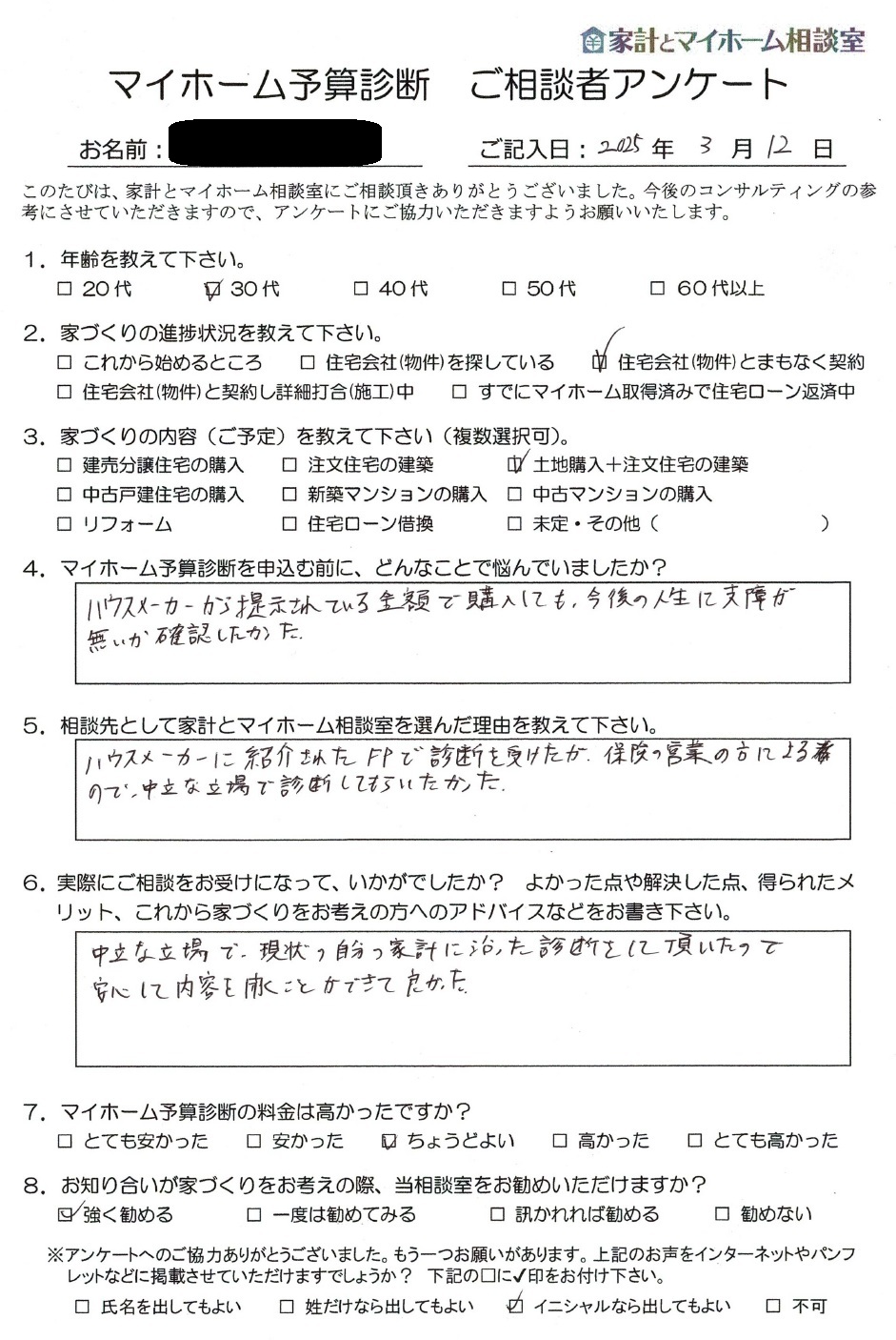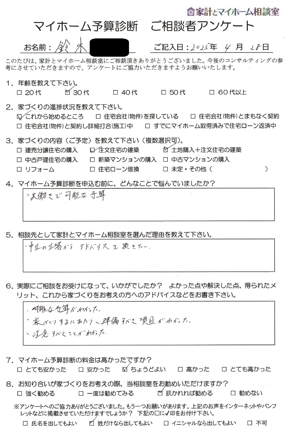 家づくりのご検討にあたりマイホーム予算診断をご提出した知多市のY.F様より、実際にマイホーム予算診断をお受け頂いたご感想