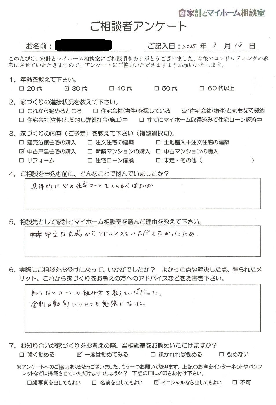 中古戸建て住宅の購入をご検討している名古屋市M.T様にご相談いただき、ご感想を頂戴いたしました。イニシャルでの公表をご了